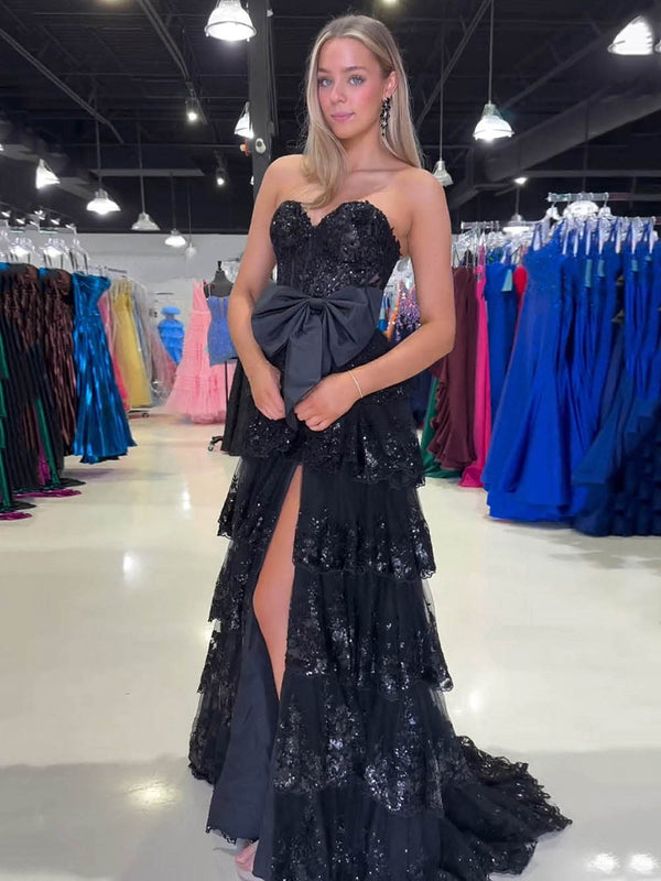 Sequin Lace Appliques Tiered Evening Dress Bow High Slit Coset Prom Dress Ms2511264