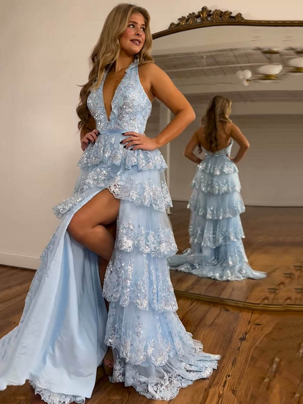 Tiered Lace Prom Dress V Neck High Slit Glitter Tulle Evening Dress Ms2511294