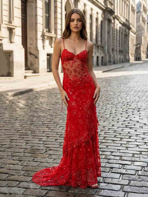 Red Mermaid Prom Dress Lace Appliques Open Back Evening Dress Ms2508141