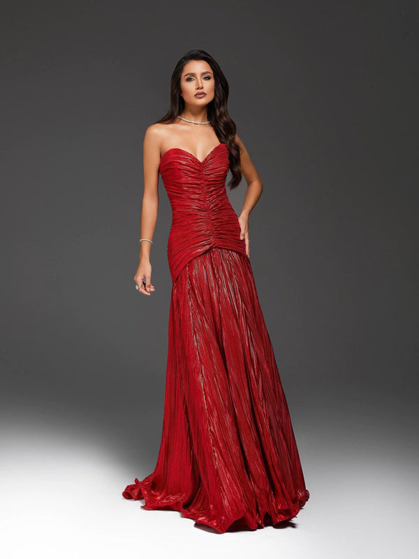 Red Strapless Ruched Prom Dress Pleated Formal Evening Gown Gala Dress Ms2604142