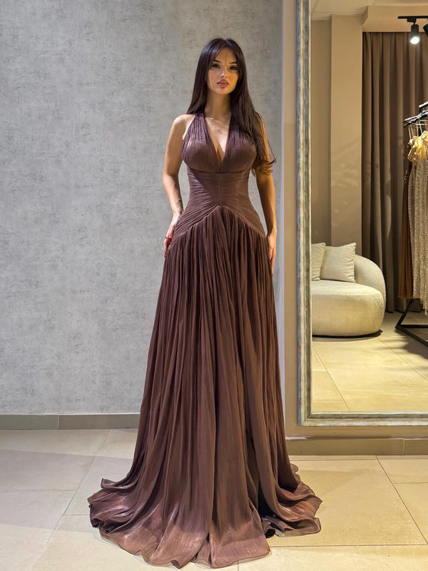 Brown Shiny V Neck Pleated Halter Evening Dress A Line Prom Dress Ms2604172