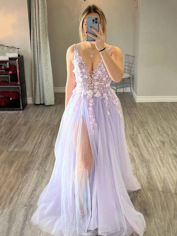 Light Purple 3D Floral Tulle V Neck A-Line Prom Dress with Slit Ms2511014