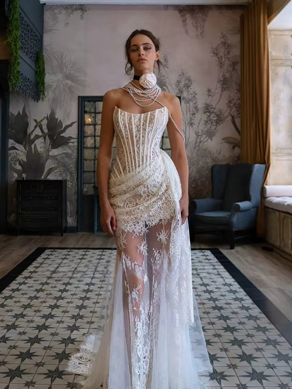 Lace Corset Bridal Dress Illusion Vintage Sexy Mermaid Wedding Dress With Detachable Train Ms2505104