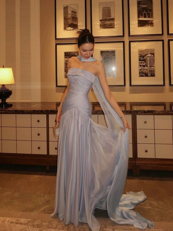 Shiny Strapless Ruched Prom Dress Elegant Draped Formal Evening Gown with Scarf Ms26041451