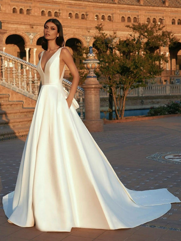 Sexy Deep V-Neck Sleeveless Bridal Dress Lace Appliques Satin A-Line Wedding Dress For Bride Big Bow