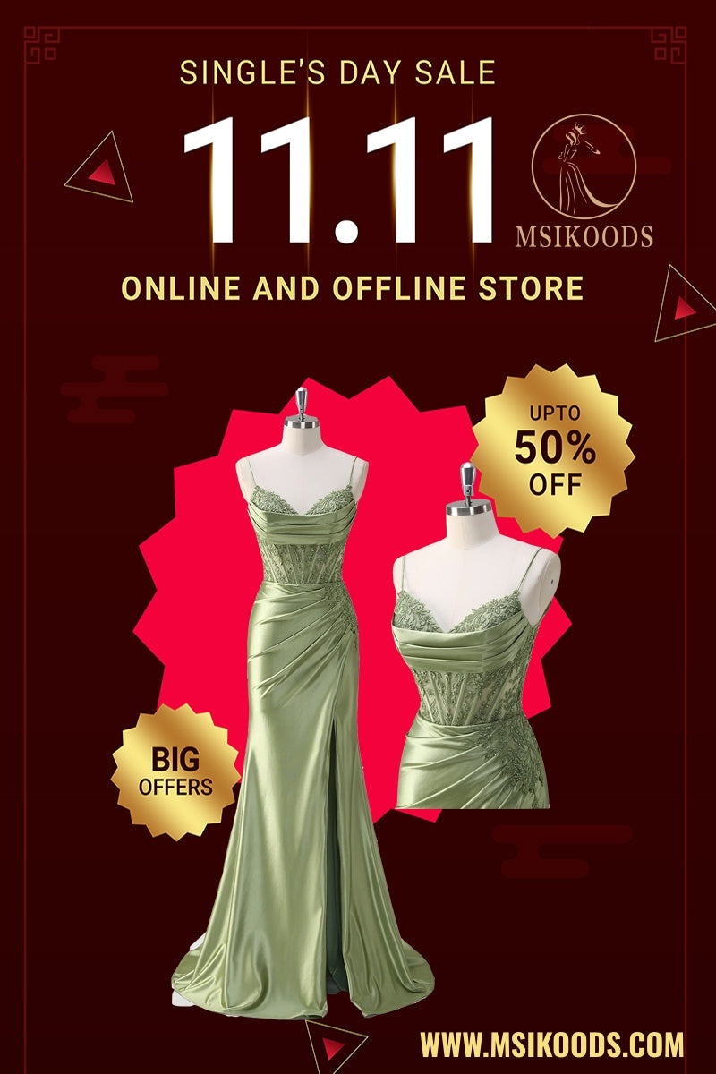 Green Satin Prom Dress Spaghetti Straps Slit Illusion Corset Evening Dress Ms2507201