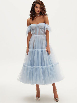 Off Shoulder Blue Midi Prom Dress Corset Soft Tulle Party Gowns Ms2506022