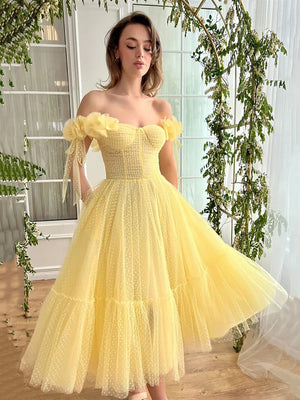 Yellow Off Shoulder Midi Prom Dress Polka Dot Tulle Party Dress Ms2508284