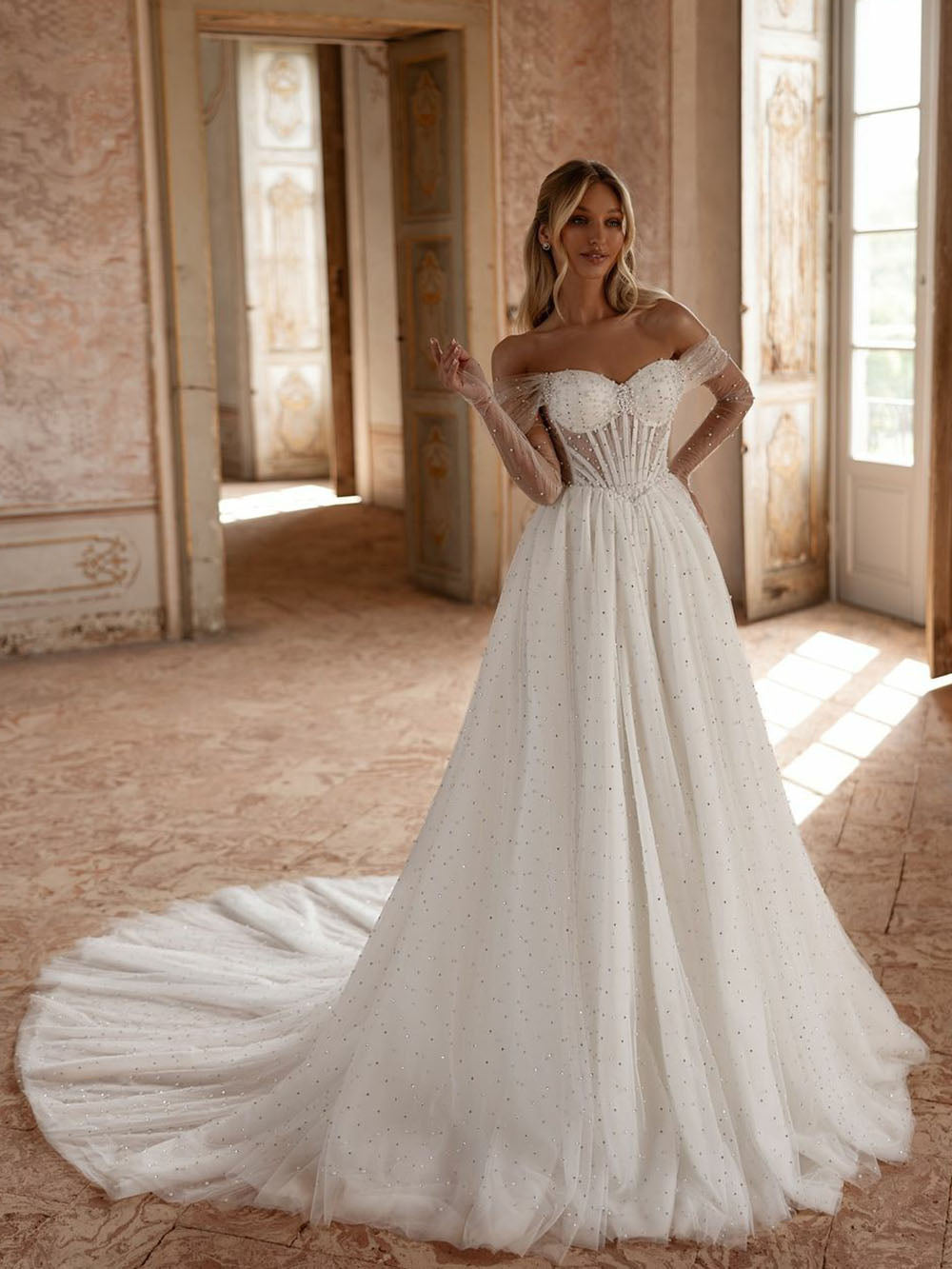 فستان زفاف الأميرة الحبيبة للنساء مع لؤلؤ متلألئ وأكمام طويلة وفستان عروس هيكلي فستان حفلة