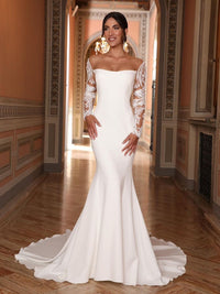 فستان زفاف حورية البحر الأنيق برقبة دائرية وأكمام طويلة من الدانتيل مع ذيل المحكمة