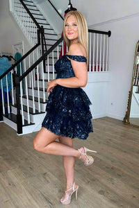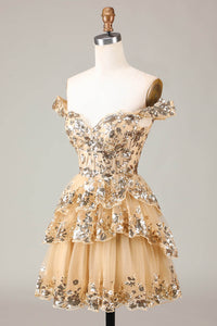 Gold Sequin Prom Dress Lace Layered Off Shoulder Mini Party Dress Ms09193