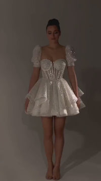 Litter Puff Sleeve Short Corset Wedding Party Dress Sparkling Layered Bridal Gown