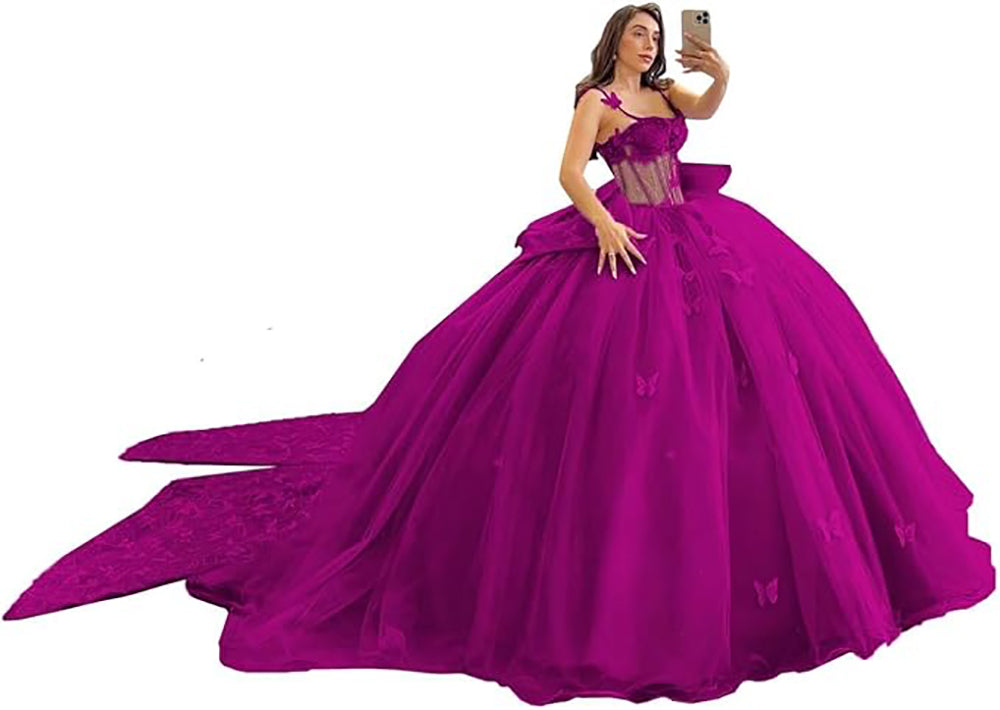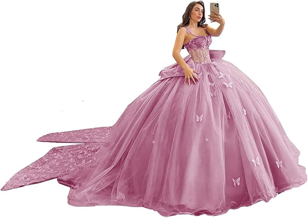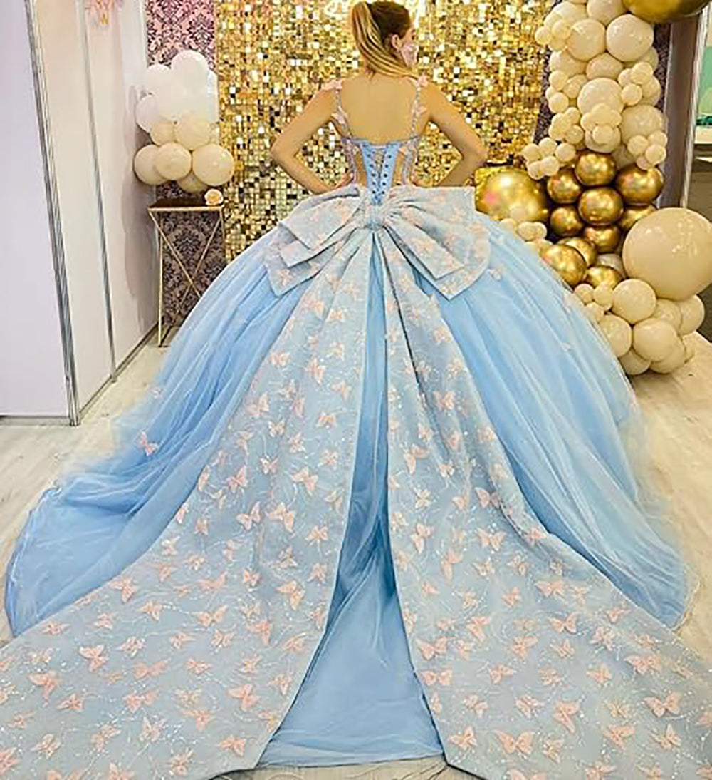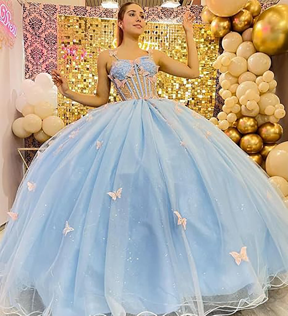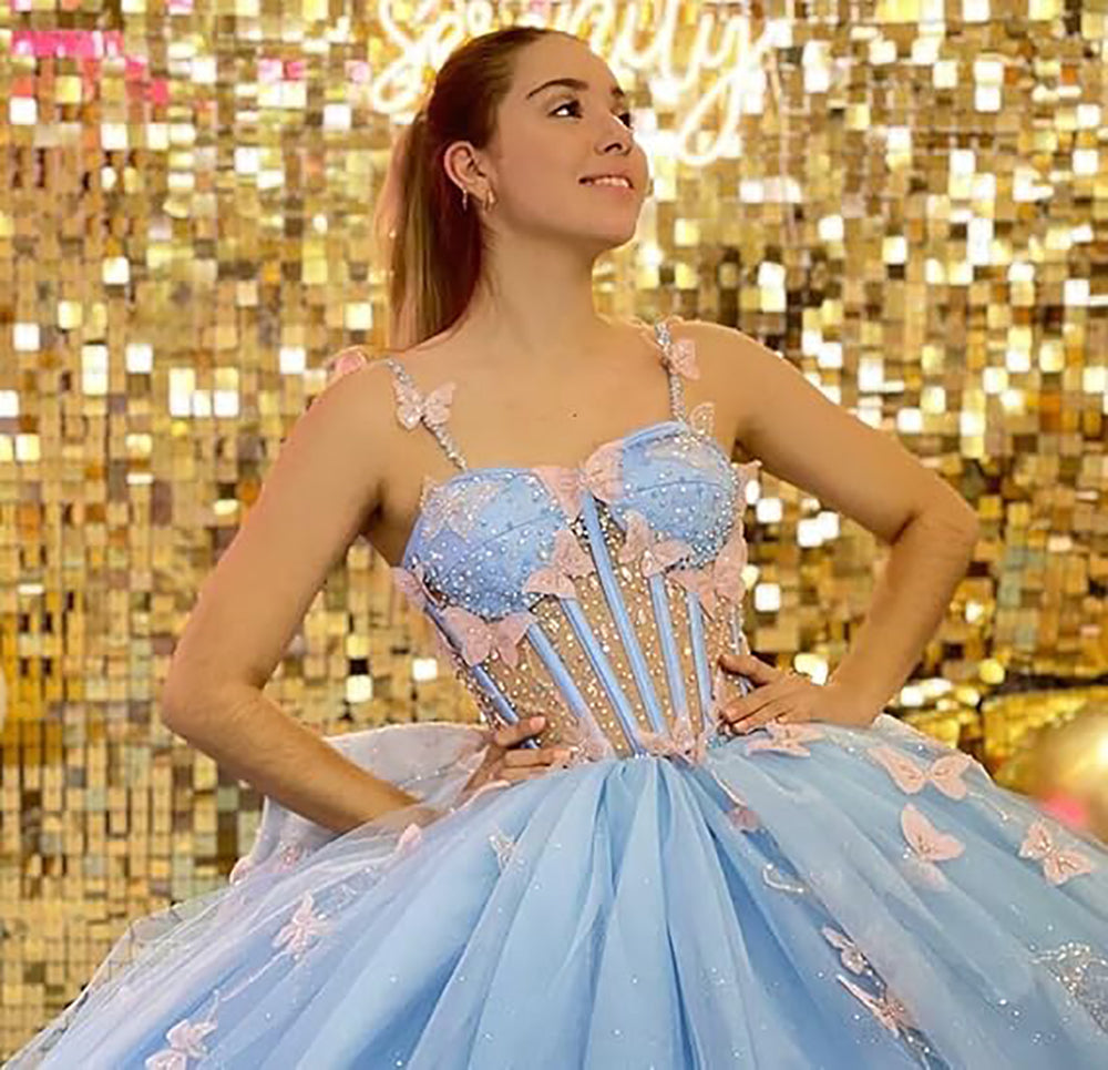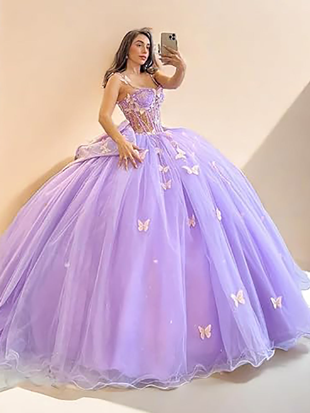 Quinceanera-Kleider mit Spaghettiträgern und Schmetterlingsspitze, mit Perlen besetzte Ballkleider, funkelnde Tüllkleider für Sweet 16