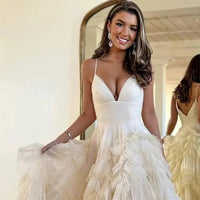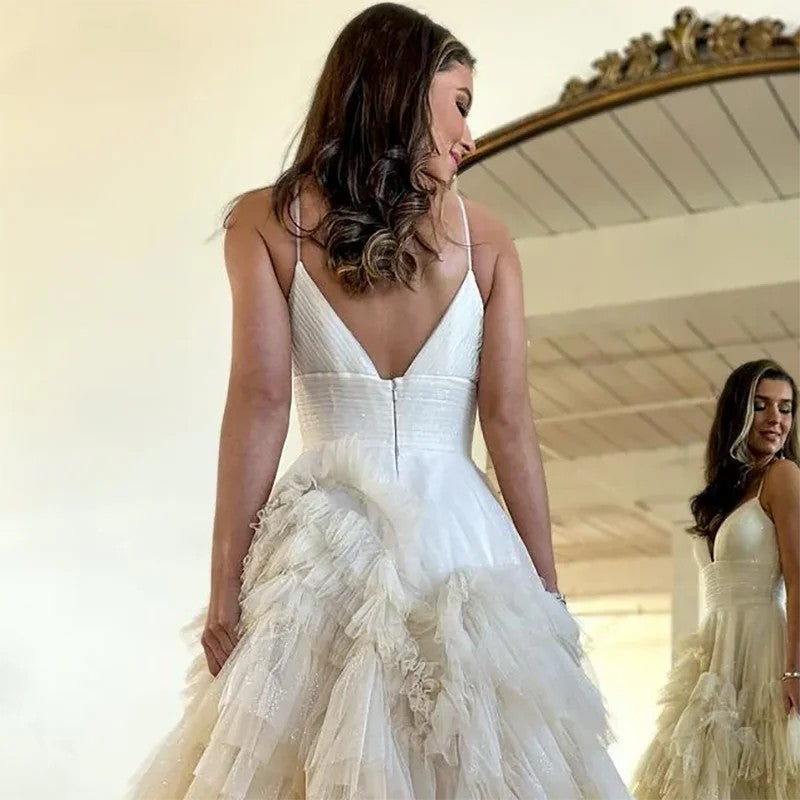 Robe de soirée sexy à bretelles spaghetti, robe de bal, col en V, jupe à volants superposée, robe de bal, robe de remise de diplôme en tulle pailleté