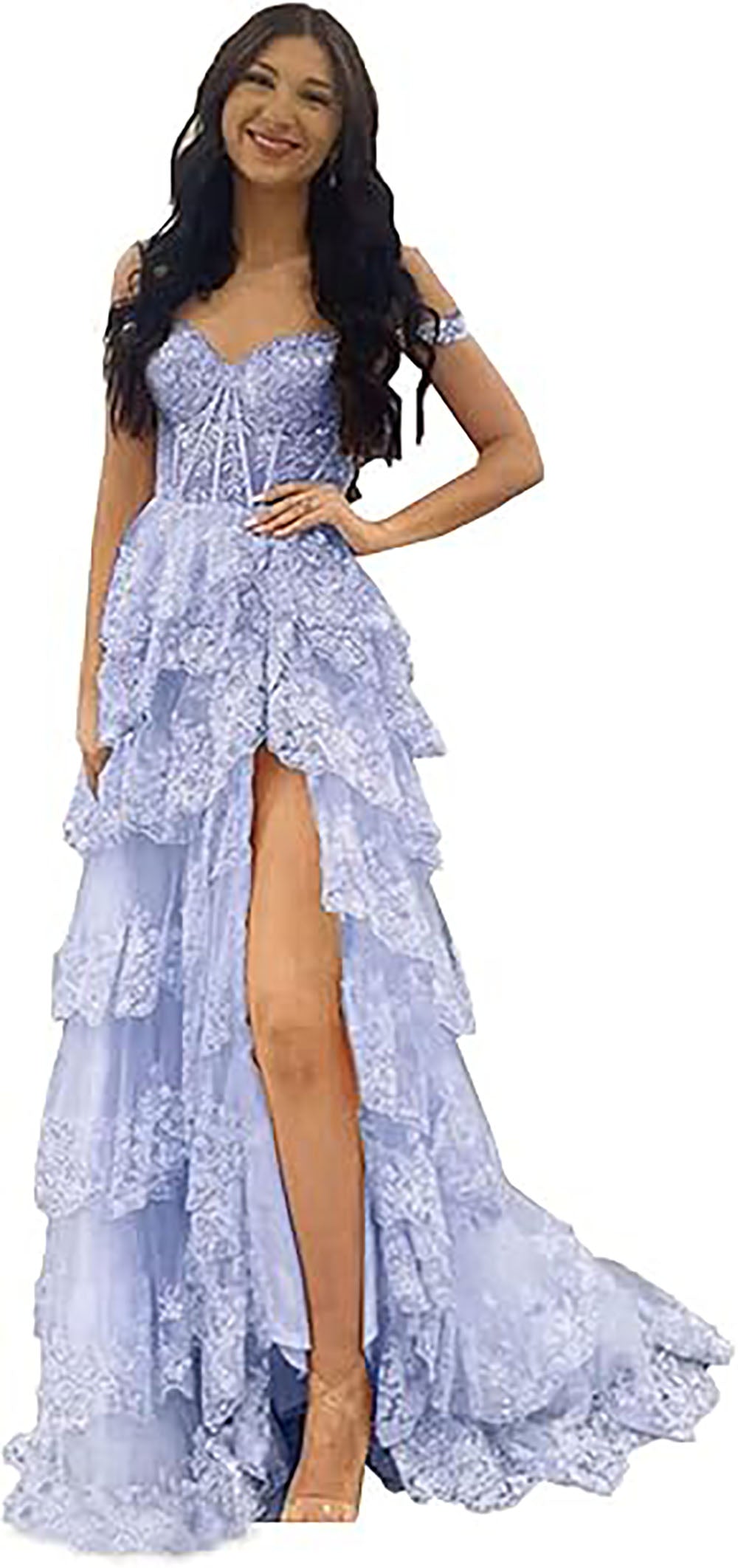 Robe de soirée longue en tulle à épaules dénudées pour femme avec appliques en dentelle et fente