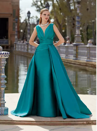 Elegante abito da sera in raso turchese con strascico staccabile, scollo a V, abito da ballo da donna per occasioni speciali