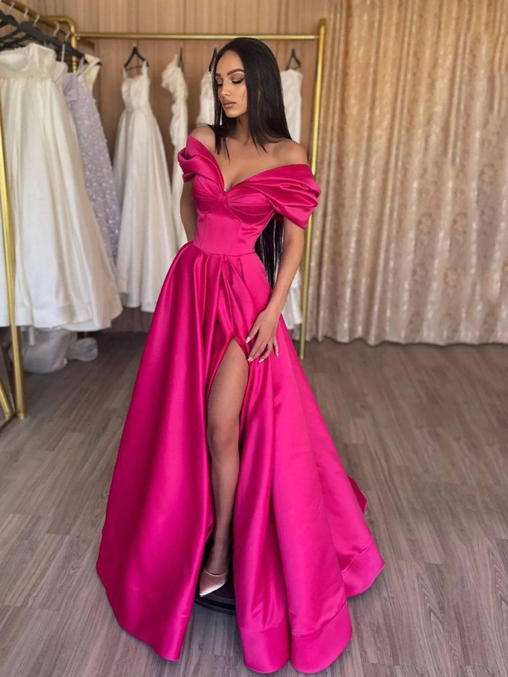 Abito da sera in raso con spalle scoperte 2025, spacco, abito formale da ballo, abito da festa serale Ms2505082