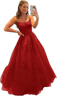 Abiti da cerimonia lunghi a gonna ampia per adolescenti con spalline sottili e applicazioni in pizzo, abito da sera formale