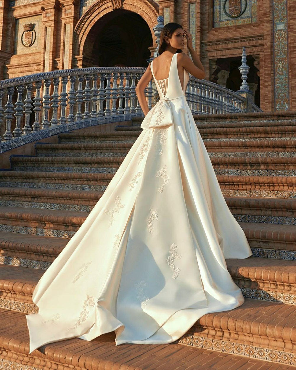 Sexy abito da sposa senza maniche con scollo a V profondo, applicazioni in pizzo, raso, linea ad A, grande fiocco