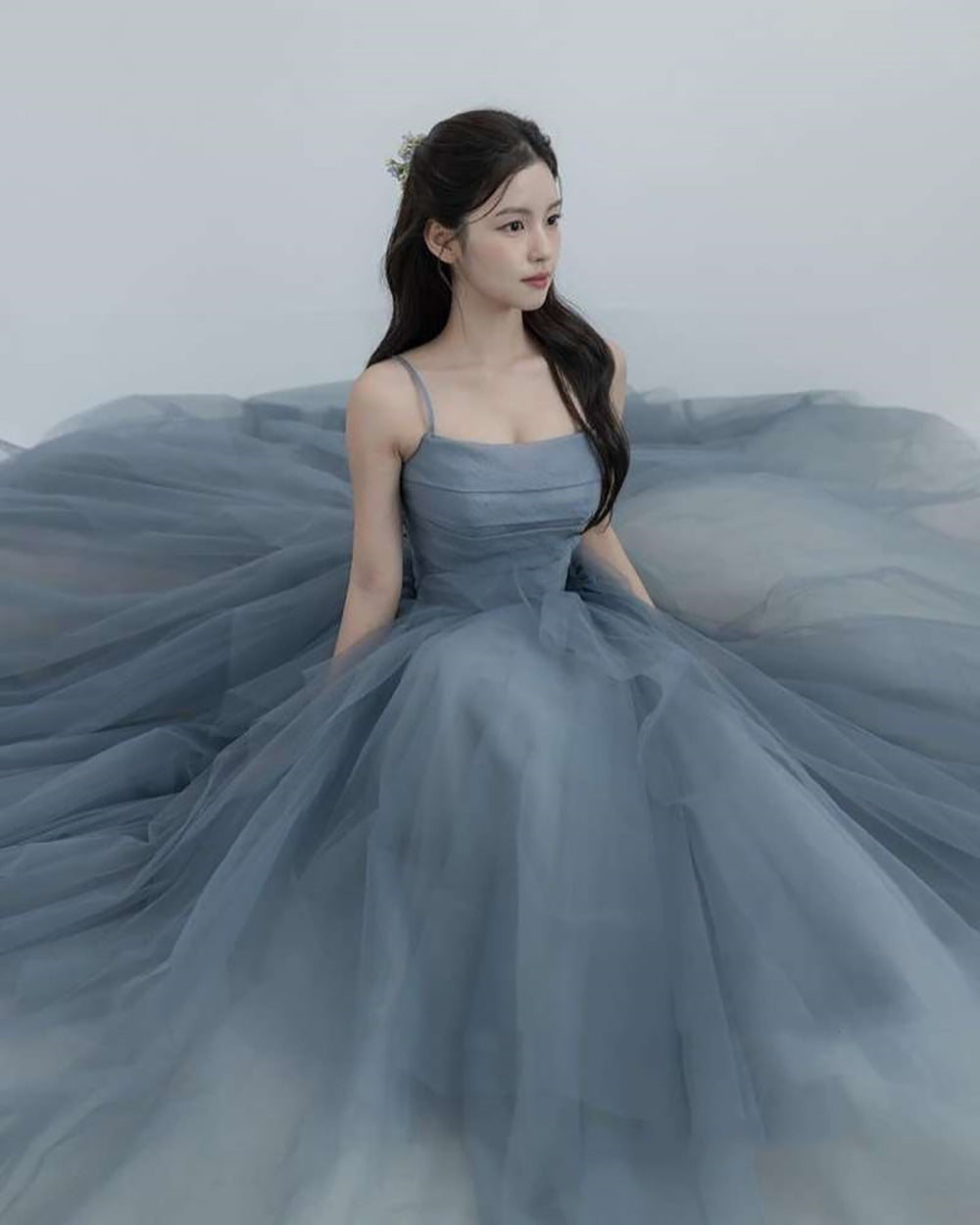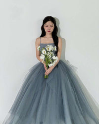 Abito da ballo principessa in tulle con spalline sottili, abito da sposa grigio con gonna gonfia