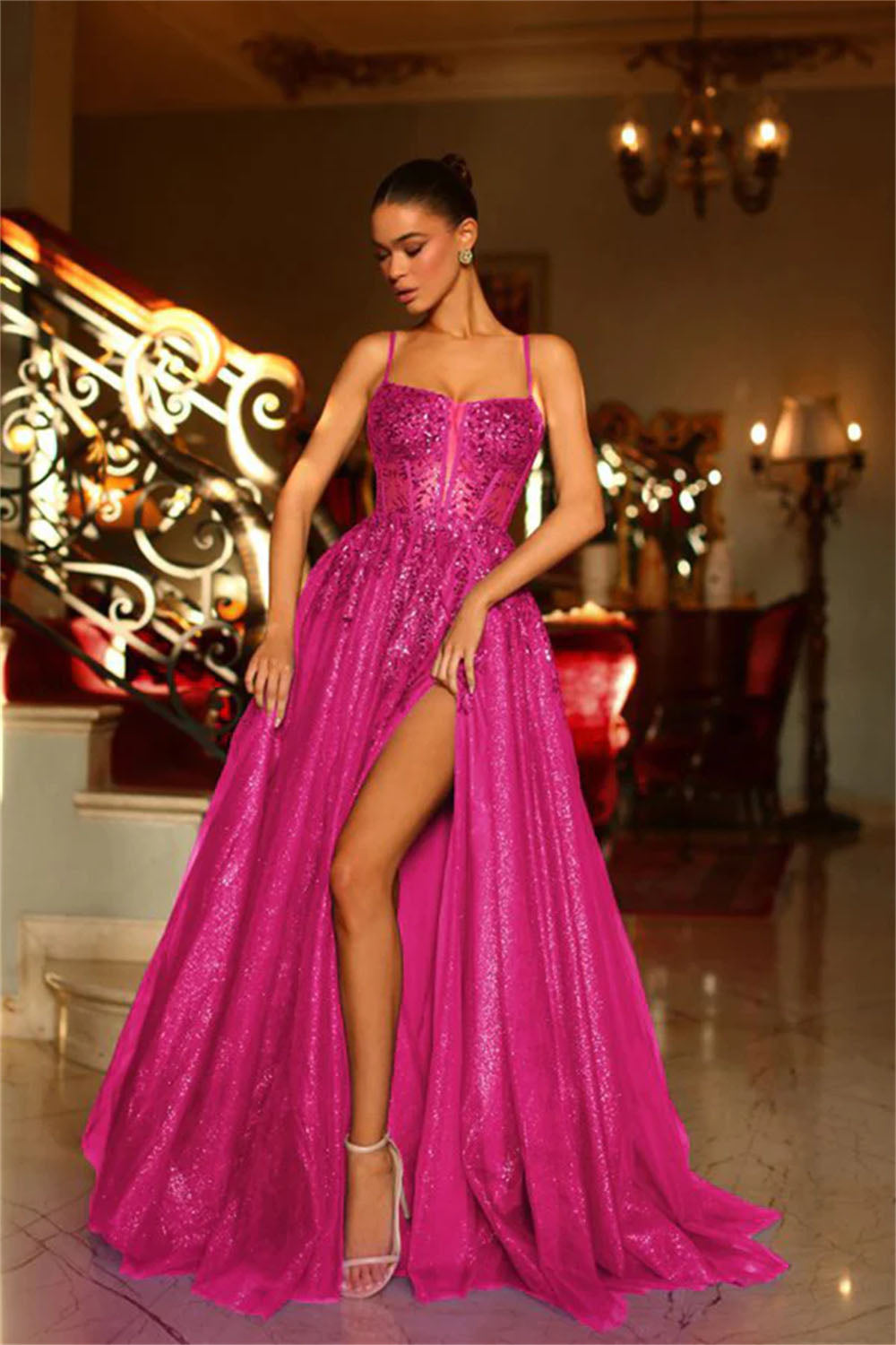 Abito da sera formale glitter con spalline sottili a linea ad A e spacco Ms2504014