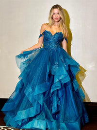 Abito da sera a strati in tulle glitterato, abito da ballo blu con spalle scoperte, abito da sera scintillante Ms2503293