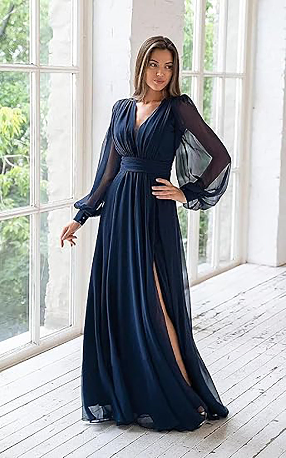 Abito da damigella d'onore a maniche lunghe da donna, scollo a V, chiffon plissettato, abito da festa nuziale, abito da sera formale con spacco
