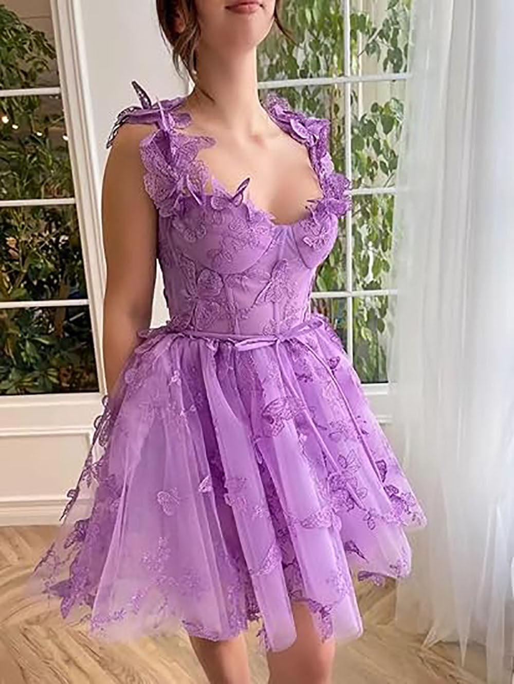 Abito corto da sera in tulle da donna con farfalle 3D, abiti da ritorno a casa con applicazioni in pizzo, abiti da cocktail con spalline sottili