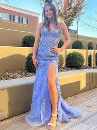 Vestidos de Baile Elegantes com Aplicação de Renda, Estilo Sereia, Fenda, Alças Finas, Vestidos Formais em Tule, Vestidos de Festa Sensuais