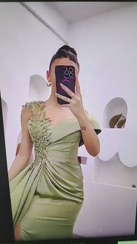 Vestido de Baile Elegante Verde-Sálvia Ombro a Ombro com Apliques de Contas Vestido de Festa Sexy com Fenda Alta