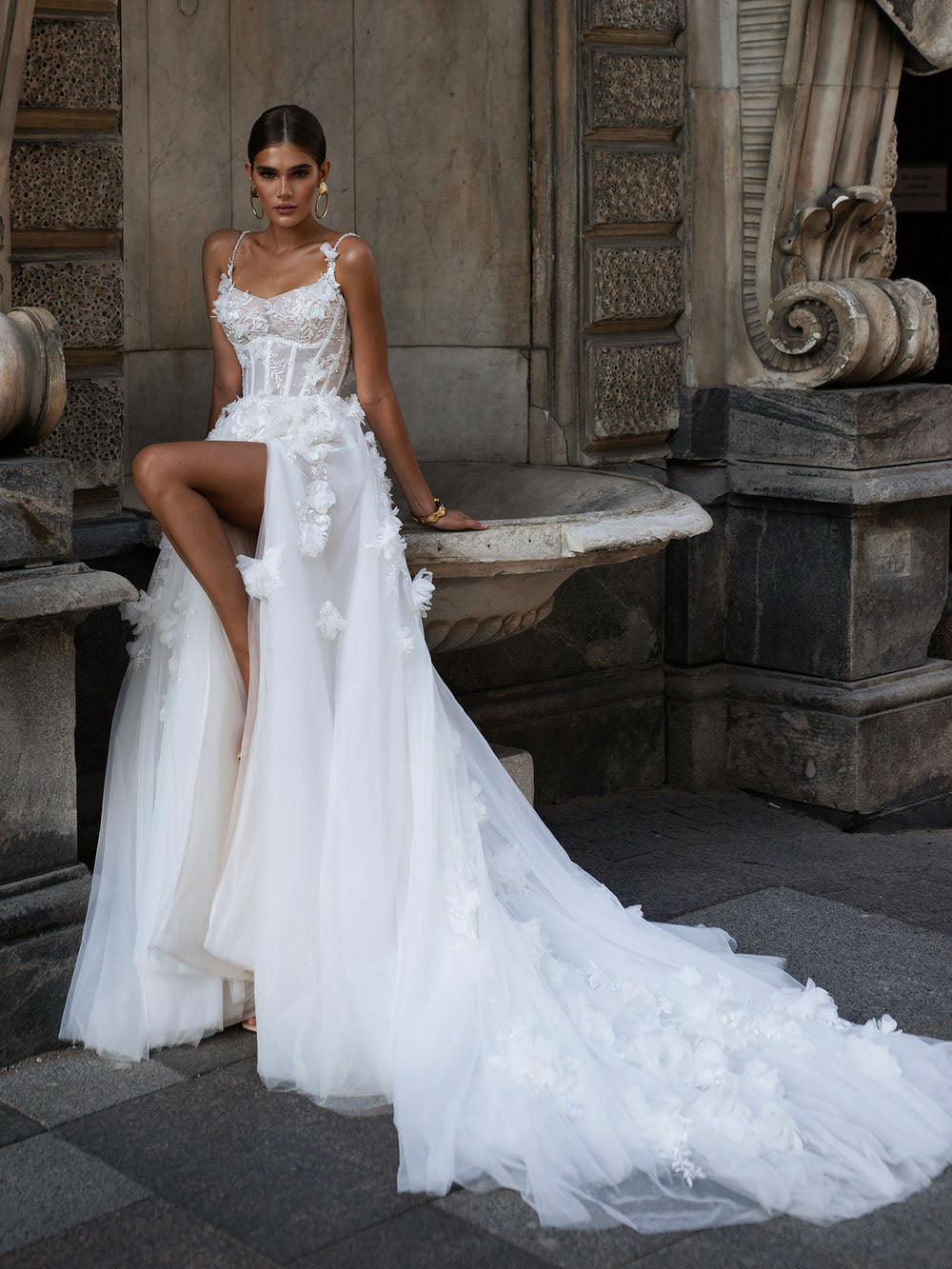 Vestido de Noiva de Luxo 2025 com Flores 3D, Alças Finas, Aplicações de Renda, Sem Mangas, Vestido Boémio para Mulheres
