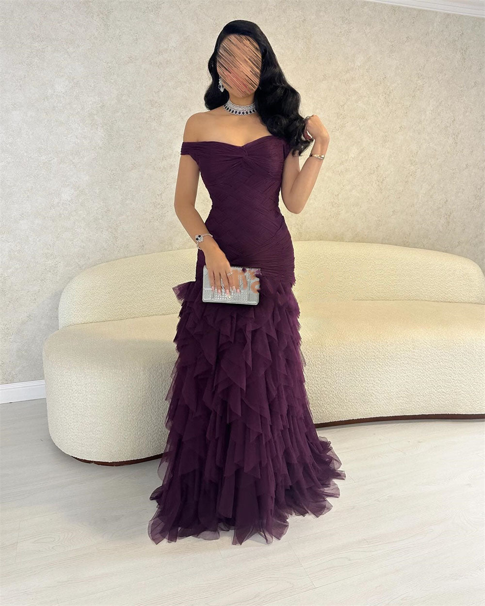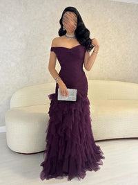 Vestido Sereia Ombro a Ombro 2025 Saia de Tule em Camadas com Folhos Vestido Formal para Festa à Noite Ms2505021