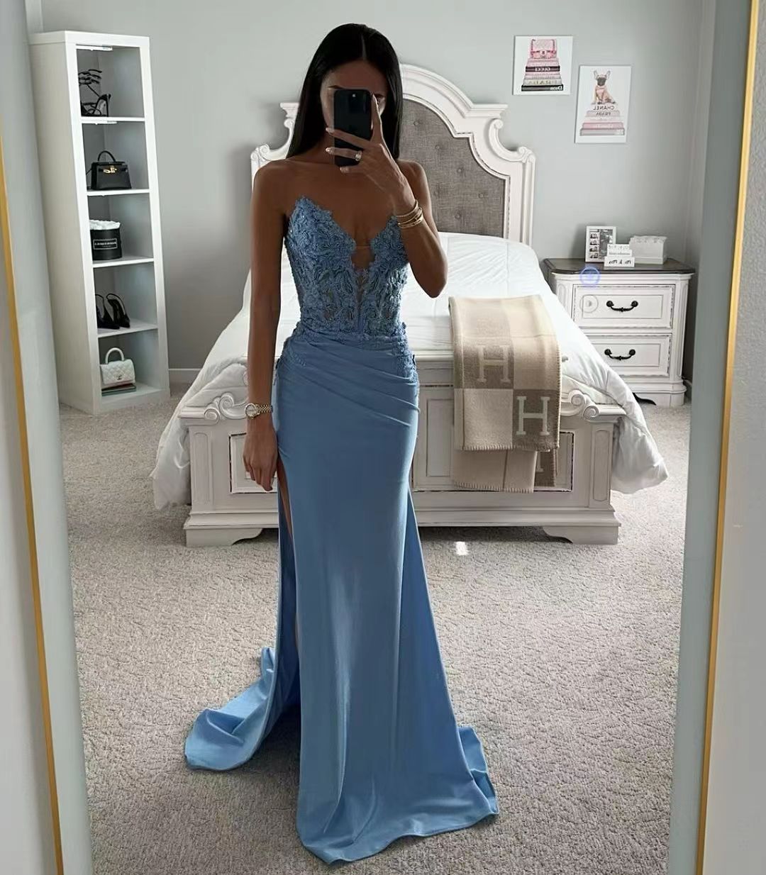 Vestidos de Noite Blue Mermaid com Fenda Lateral, Decote em V, Aplicações de Renda, Vestido Formal Elegante, Vestido para Ocasião Especial