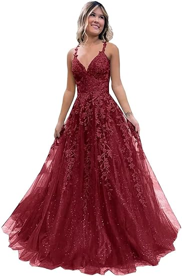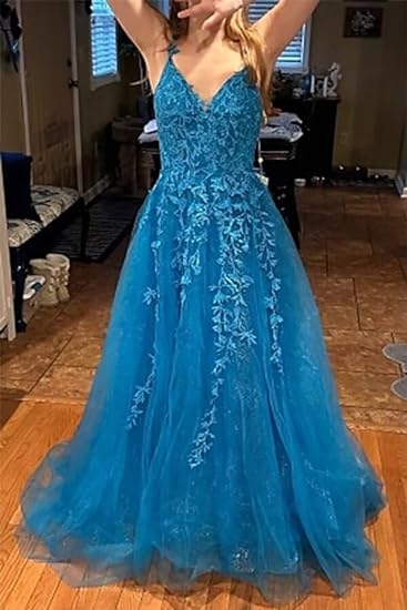 Vestido de Festa Longo em Tule com Aplicações de Renda Brilhante Fivsole, Corte em A Formal para Noite